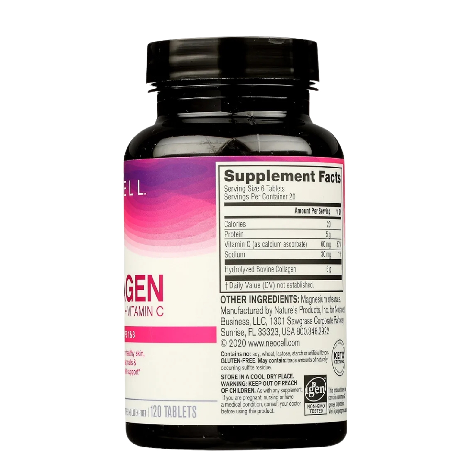 COLLAGEN TABLETS: For maximum results, take 6 tablets every day. Contains 6,000mg NeoCell Collagen Types 1 & 3 per serving + Vitamin C